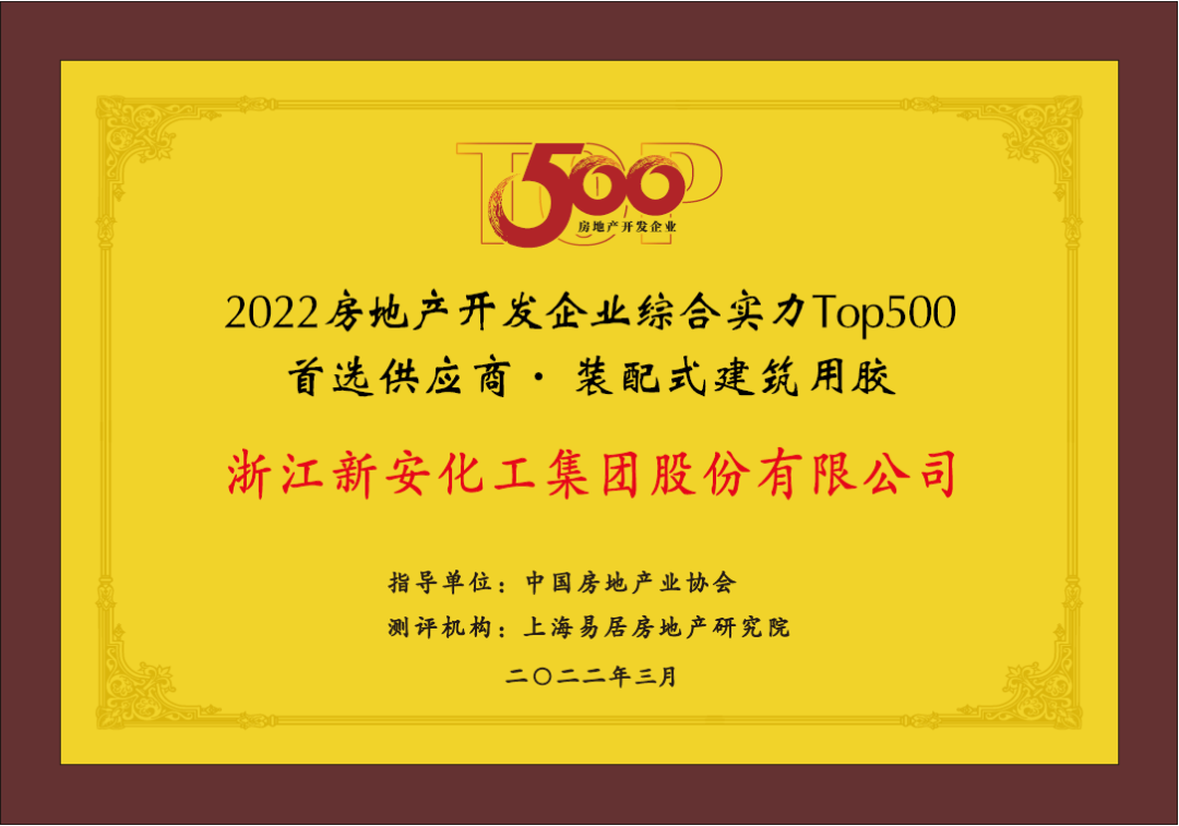 獲評“2022中國房地產(chǎn)開發(fā)企業(yè)綜合實力Top500首選供應商-裝配式建筑用膠”